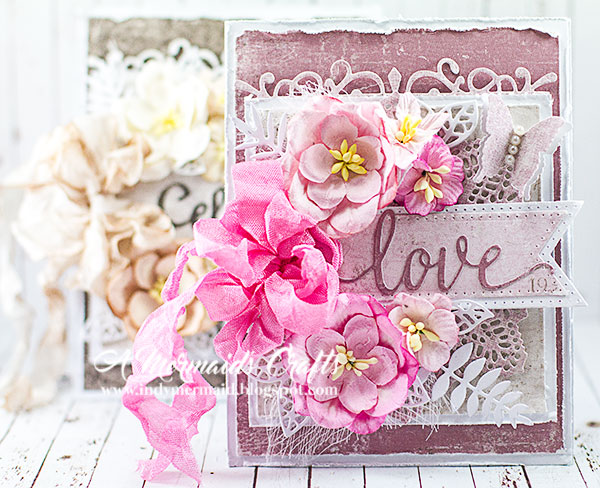 A Prima Crochet Doily was layered in the background. Beneath the gorgeous Wild Orchid Crafts flowers are Sue Wilson Mosaic Leaves and Paper Smooches Foliage 2 dies. This beautiful crinkle ribbon is Rose from the Vintage Vineyard Bundle. Love is a My Creative Time die.