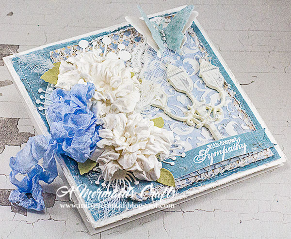 Your cards look gorgeous, the requested card is just as stunning as the original. I love the texture paste technique and all of the distressing you did! So many amazing embellishments and layers you added! The flowers and ribbons are stunning as is the cherub fountain. One can only hope that the card will provide the recipient with a bit of comfort during their time of sorrow.